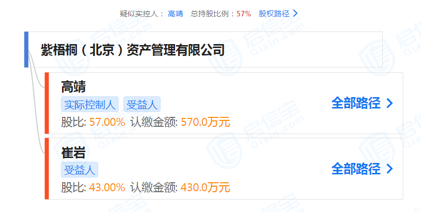 启信宝股东信息显示,该公司由高靖和崔岩联合持股,持股比例分别为57%和43%。