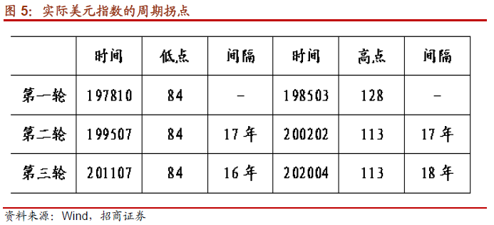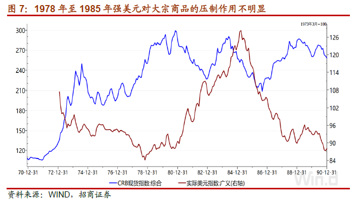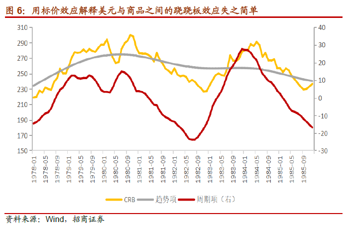 美元与大宗商品价格之间的“跷跷板”效应,绝非所谓“标价效应”那么解释。市场上常用“标价效应”来解释美元与大宗商品价格之间的“跷跷板”效应,但这只是解释而已,失之简单,甚至不能自洽。例如1978年至1985年,实际美元指数从底部的84上升至高点的128,升幅达52.3%。同期大宗商品价格在200-300的区间内波动,更多受库存周期影响,不存在明显的下行趋势。