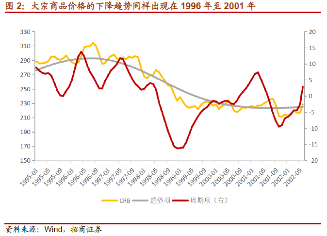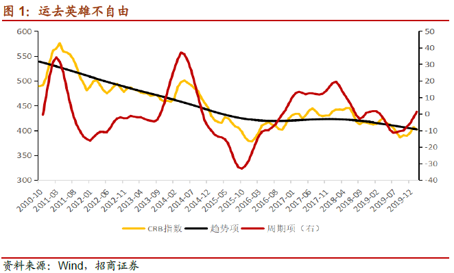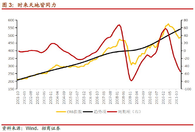 2002年至2011年,大宗商品价格的趋势项从-80上升至60。这9年间,CRB现货指数从底部200上升至高点的600左右,连战连捷,越战越勇。分解来看,同样存在明显的3轮库存周期,企业加库存行为带来商品价格的上升,并且在趋势的作用下,大宗商品的高点越来越高。