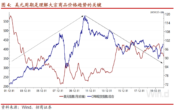 美元和大宗商品价格之间存在“跷跷板”效应。大宗商品价格在美元强势期呈下行趋势,在美元弱势期呈上升趋势。刚刚过去的9年中,实际美元指数由2011年7月低点的84上升至2020年4月的113,升幅达34.5%。上图可见,强势美元大宗商品价格的弱势基本一致。反之,2002年至2011年,实际美元指数从113的高点回落至2011年7月的84,回落幅度达25.7%。美元弱势周期与大宗商品价格的扩张周期一致。据此推论,从2020年开始,美元已进入新一轮弱势周期,大宗商品价格进入新一轮繁荣周期。