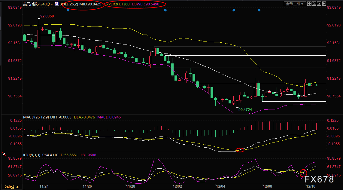低位震荡;MACD金叉,KDJ金叉,布林线初步开口,汇价有望沿布林线上轨震荡上行,上方阻力位分别参考91.50、91.83和92.05位置。