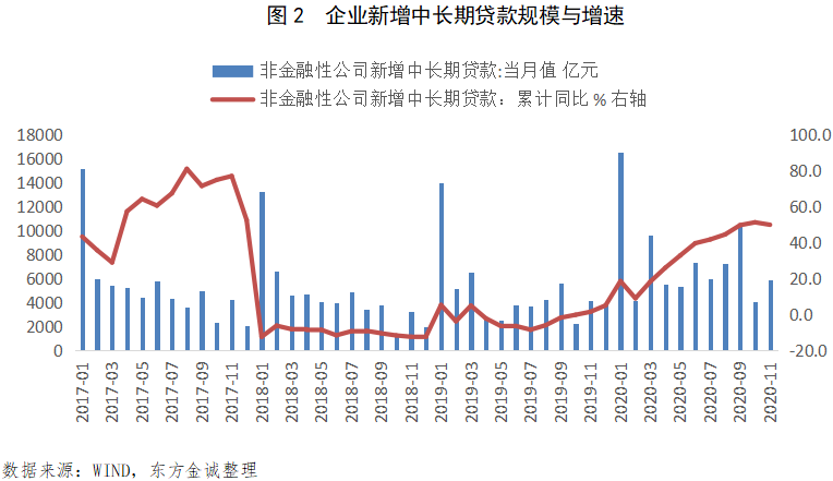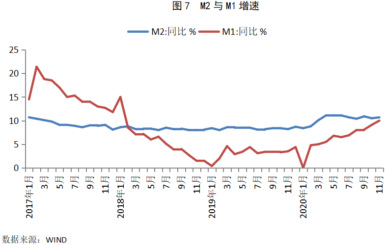 11月末M2增速反弹,与财政存款季节性下滑直接相关,不改其波动下行的大方向;11月末M1增速续创新高,主要体现经济修复进程较快推进,各类市场主体经营、投资活动趋于活跃,企业活期存款增速加快。