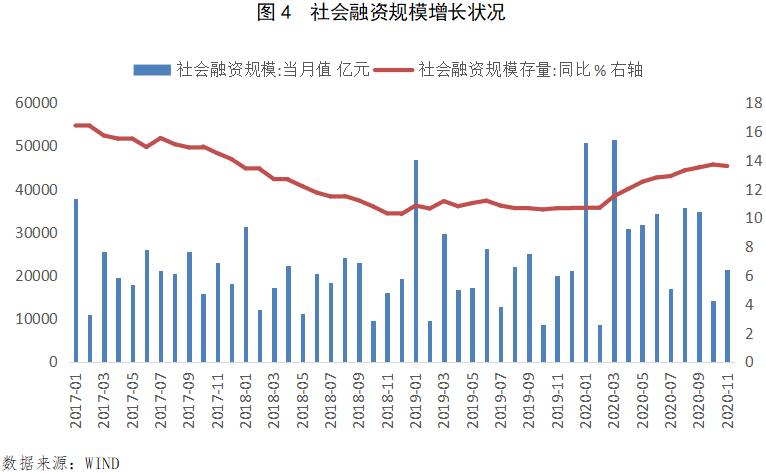 11月新增社会融资规模2.13万亿,环比多增7127亿,同比多增1363亿;11月末存量社会融资规模283.25万亿,同比增长13.6%,增速比上月下滑0.1个百分点,比上年同期高2.9个百分点。11月末,M2同比增长10.7%,增速比上月末上升0.2个百分点,比上年同期高2.5个百分点;M1同比增长10%,增速比上月末高0.9个百分点,比上年同期高6.5个百分点。