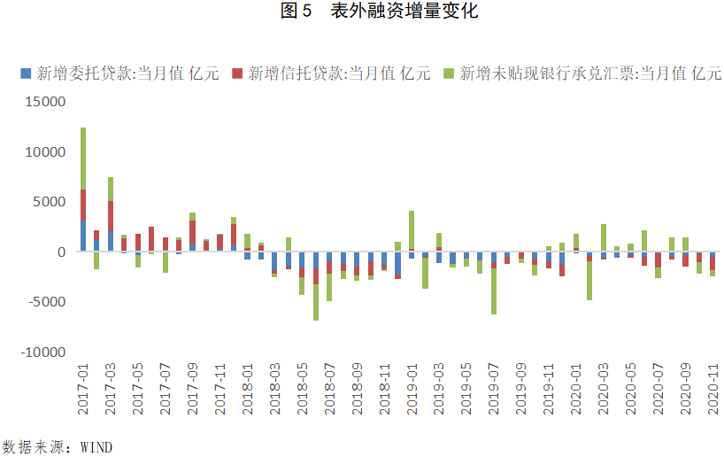 二、主要受新增人民币贷款季节性回升,以及表外票据融资环比少减拉动,11月社融环比较大规模多增;在政府债券、人民币贷款和委托贷款多增或少减带动下,当月社融同比多增,但因企业债券、信托贷款和表外票据融资三项拖累较大,整体社融并未明显超出季节性。11月末社融存量增速小幅放缓,初步印证“10月或为此轮社融增速回升高点”的判断。
