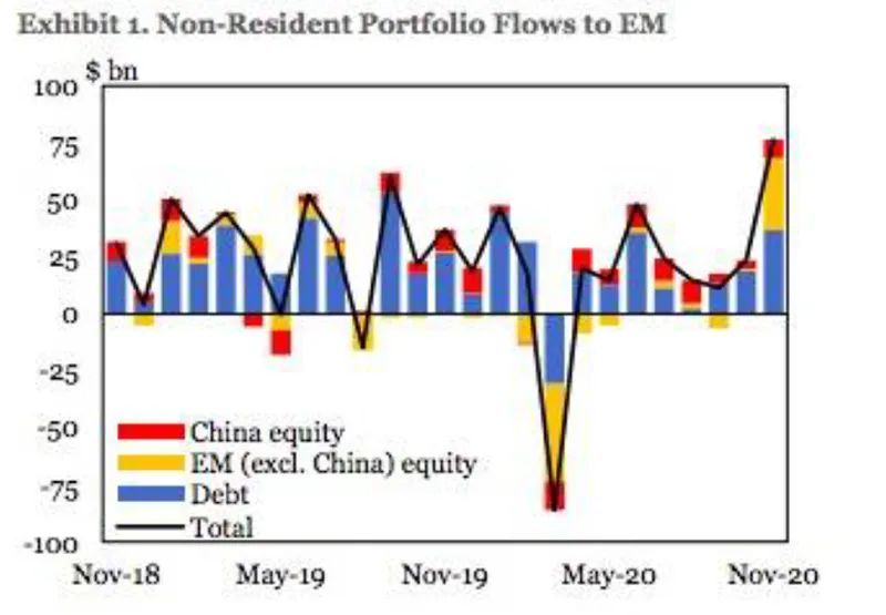 IIF经济学家Jonathan Fortun称,近期与疫苗相关的积极进展,叠加美国大选的不确定性消除,促进了资本流动。2020年第四季度也有望成为自2013年第一季度以来,新兴市场资金流入最强劲的季度。