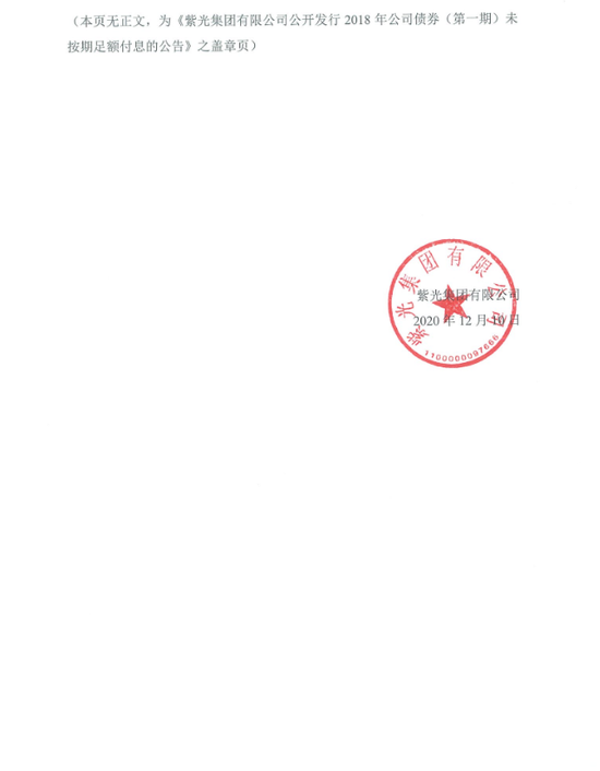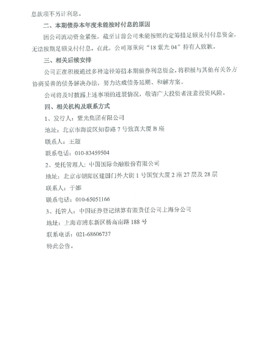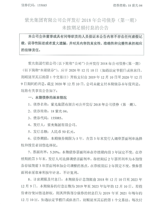 紫光集团有限公司公告称,由于公司流动资金紧张,“18紫光04”未能按期足额付息.。本期债券发行总额50亿元,债券期限3+2年,票面利率5.20%。