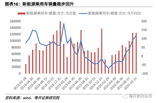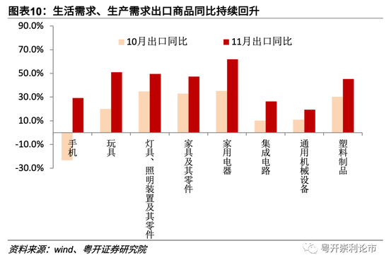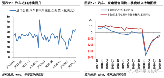 出口端方面,防疫物资对于出口的支撑在10月下降后又有所回升,同时消费电子、玩具、家电家具等生活需求和集成电路、通用机械等生产需求也在持续回升,在全球经济活动、产业链逐步恢复的背景之下,居民消费需求将从必需品转为可选消费。进口端方面,受益于19年的低基数和国内汽车供需两旺,汽车单月进口额持续提升,汽车、家电的销售同比自二季度以来也持续回暖。