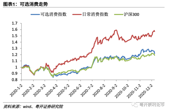 以2020年年初指数水平为基点,大致将可选消费春节后的走势分为以下三个阶段:第一阶段是从节后到5月下旬,由于后续的经济复苏节奏尚未明朗,可选消费总体跑输大盘。第二阶段是从5月下旬到9月初,经济边际改善确定性高,两会结束后政策进入兑现阶段,“内循环”战略布局下,可选消费追赶大盘。但相较而言,这一阶段必选消费的确定性及投资性价比更高,与日常消费指数的相对收益差距进一步拉大。第三阶段是从9月份以来,在以国内大循环为主体,国内国际双循环相互促进的新发展格局下,消费成为促进经济复苏的重要动力,尤其是在消费升级的趋势下,智能化、高品质的产品更受青睐。叠加出口数据向好,内外需共振进一步强化可选消费复苏的确定性,可选消费指数走势超越大盘,展现出较大的市场潜力,短期可选和必选消费呈现出来一定的跷跷板效应。