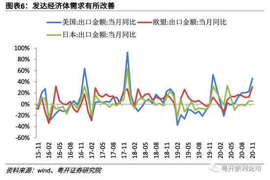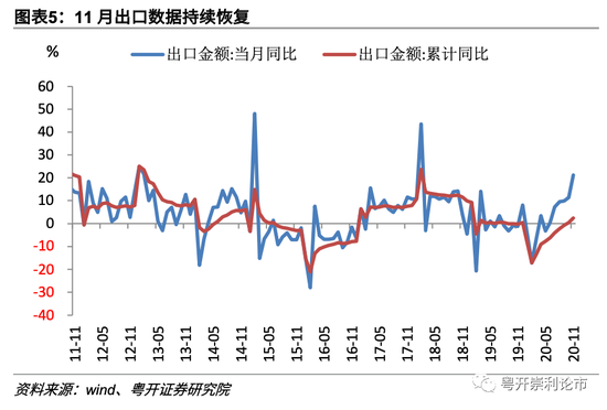 11月中国出口(美元计价)同比21.1%,出口数据持续恢复,全球经济复苏带动的需求回暖是带动出口强劲的重要原因。