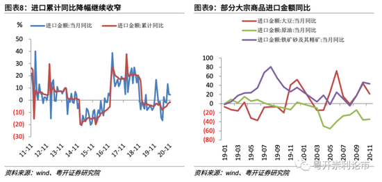 11月份进口额当月同比增速由4.7%回落至4.5%,累计同比降幅继续收窄。大宗产品进口增速有所分化,但需求整体并未走弱。具体来看,根据进口金额数据,铁矿和大豆的进口同比本月略有回落,但仍保持在40%和20%以上,原油进口金额同比降幅略有收缩。