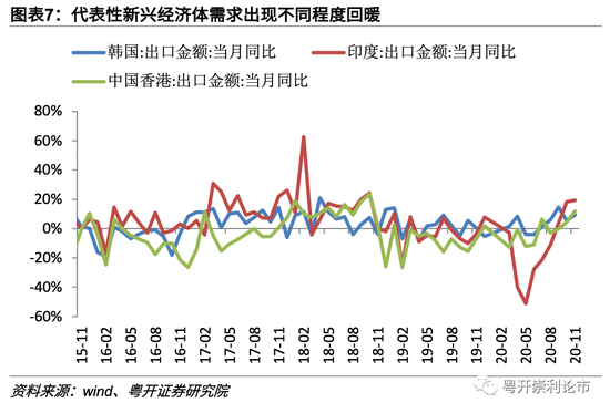代表性新兴经济体需求出现不同程度回暖。以当月值计算,中国对韩国出口同比增速由5.4%上升至9.5%,对印度出口同比增速由18.3%进一步提升至19.4%,对香港出口同比增速继10月转正后,本月升至12.1%。