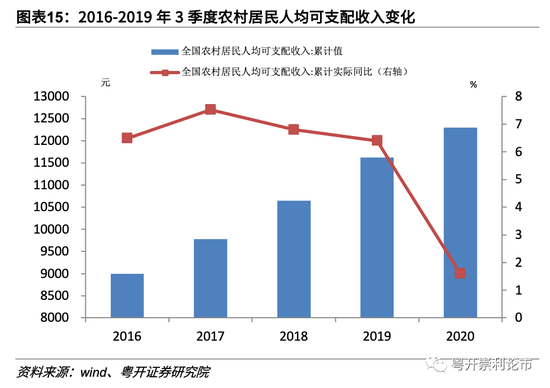 农村和城镇居民人均可支配收入逐年上升,带动消费能力提升。2020年前三季度,我国居民人均可支配收入继续保持增长,达到23781元,累计实际同比增长0.6%,其中农村居民人均可支配收入达到12297元,累计实际同比增长1.6%,“脱贫攻坚”的推进使城乡居民收入差距持续缩小,农村市场消费潜力巨大。此外,根据国务院发展研究中心报告显示,初步预计到2025年我国中等收入群体规模将超过5.6亿人,国内消费市场将超过美国。中等收入群体的扩张有利于高端消费市场潜力的释放,居民整体财富效应正在显现,拉动消费支出增长和消费结构改善。