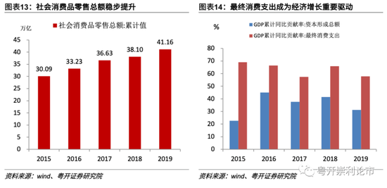 经济增长引擎正逐渐由投资驱动向消费驱动转变。“十三五”以来,消费市场蓬勃发展,社会消费品零售总额稳步提升,2019年市场规模达41.16万亿,最终消费支出对GDP增长贡献率约60%,超过投资成为拉动经济增长的重要驱动。