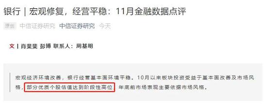 今日,券商一哥中信证券研究的官方公众号,就甩出了个不一样的说法:部分优质个股(银行股)估值达到阶段性高位,年底前市场表现主要依据市场风格。