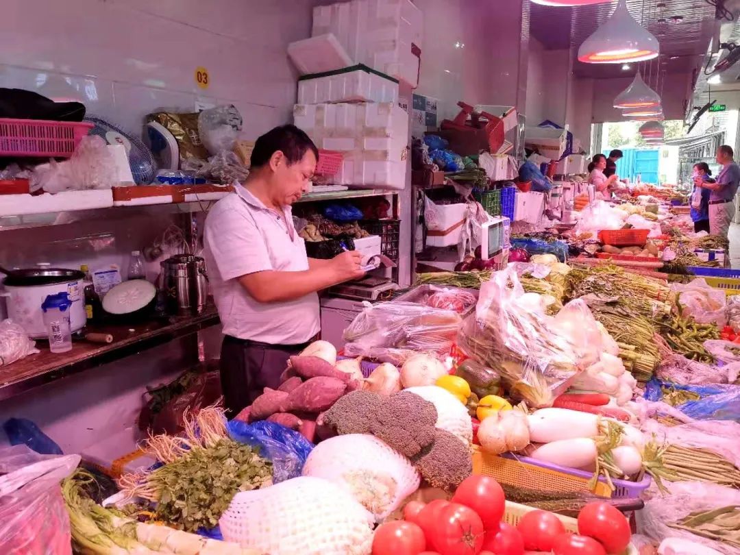 今年6月,菜市场又为每个摊贩的店铺装上了一块液晶屏幕,上面会实时显示不同蔬菜的价格和重量、店主的营业执照和身份信息、检疫合格率等信息。这是菜市场新引入的“智慧菜场”项目,一旦出现菜品质量不合格、少称等问题,顾客能够通过屏幕上的信息进行维权。这块电子屏幕还能够连接电子秤,计算商品价格。