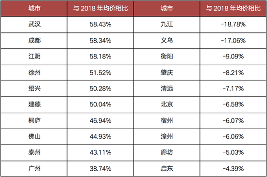 若是把房价涨跌幅范围控制在-10%至10%区间,在全部重点关注的城市中有约33个城市的房价接近2018年。其中九江、义乌两城因为跌幅超出10%范围没有计算在列。