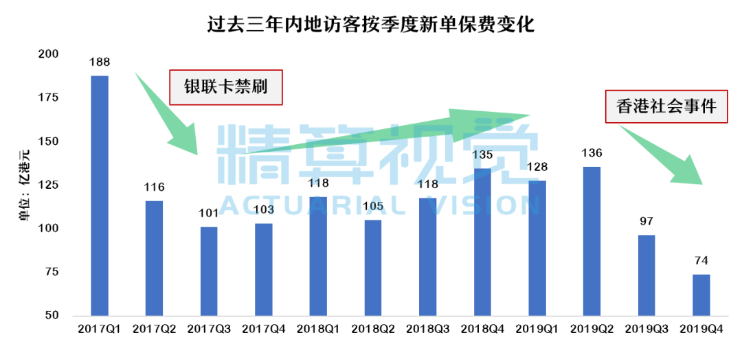 受香港社会运动影响, 2019年下半年内地访客的新单保费继三季度环比大幅下跌28.8%至97亿港元之后, 四季度进一步环比下跌23.4%至74亿港元 ,多数以内地客户为主的公司内地业务与二季度相比跌去5成 。