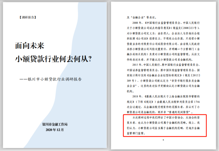 本次调研过程中银川市金融工作局拜访了中国小额贷款公司协会,“从协会的答复来看,也认为小贷公司属于金融机构范畴。综上,我们认为,小贷公司应当属于金融机构范畴,受地方金融监管部门监管。”通过《调研报告》,银川市金融工作局给出界定。