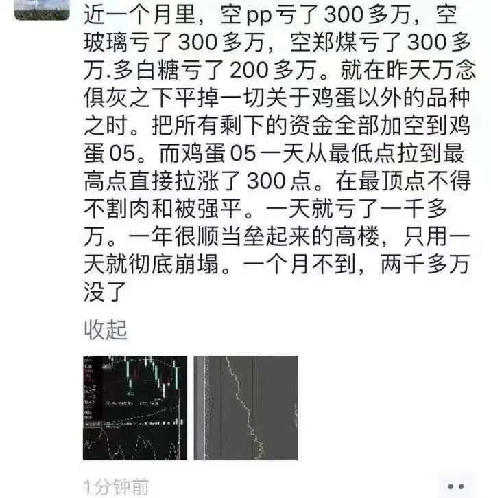 面对火热行情,最近一个月开始一路做空的期货投资者Y先生却欲哭无泪:“空PP亏了300多万,空玻璃亏了300多万,空动力煤亏了300多万,空白糖亏了200多万。就在昨天万念俱灰之下平掉一切关于鸡蛋以外的品种,把所有剩下的资金全部加空鸡蛋05合约的时候,这个合约一天拉涨了300多点。”Y先生在朋友圈中自己复盘了最近的交易过程及“战果”——“一个月不到,两千多万没了。”
