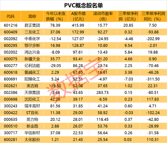 这18只PVC概念股年内平均上涨16.64%,跑赢同期大盘(9.74%)。其中,瑞丰高材年内累计上涨81.56%,涨幅居首。公司是PVC助剂行业龙头企业之一,产能已达12万吨/年,位居行业前列。君正集团、沈阳化工、华信新材、三友化工等均涨幅居前。