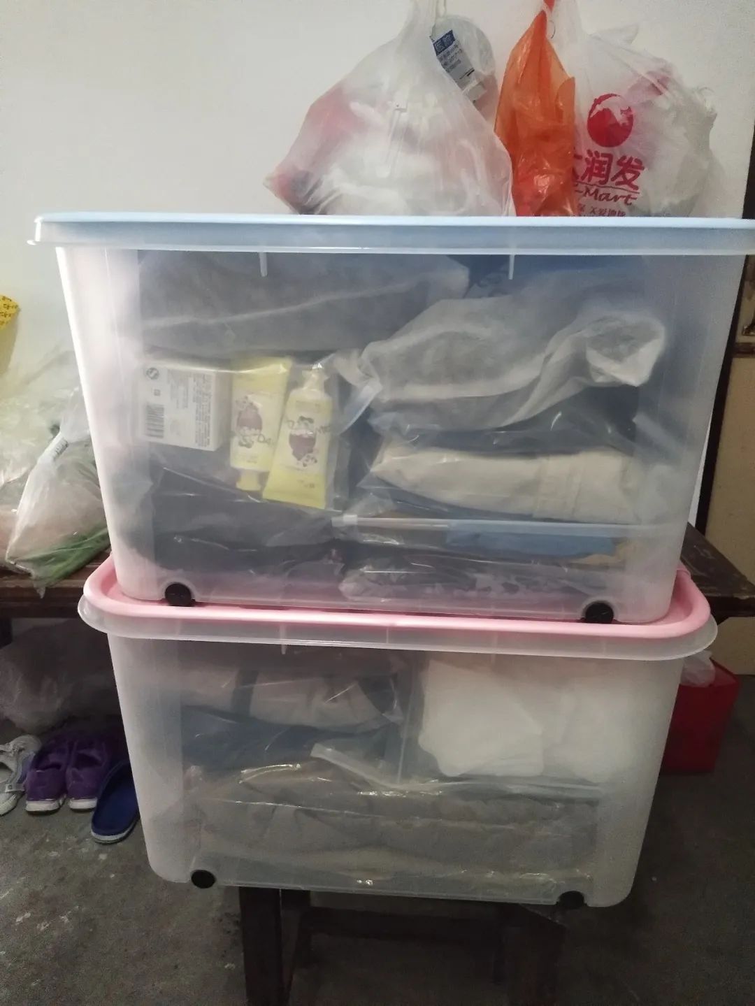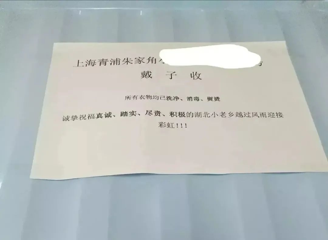 有一对中年夫妻搬来了两大收纳箱的衣服。上面附了一张纸,印着“所有衣物均已洗净、消毒、熨烫”几行字,衣服被分装在一个个袋子里,就像外面买的一样。当时,戴子的老婆感动得不知道说什么。