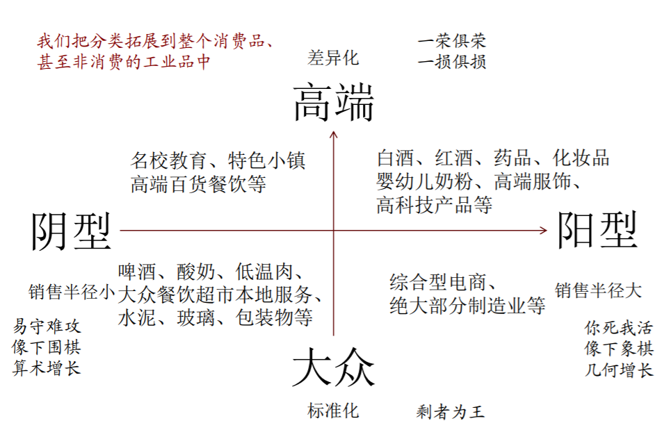 我形成了很多种产品属性的分类,觉得最重要的分类维度有两个方面:一是高端和大众;二是根据产品销售半径大和小,分成阳型和阴型。高端品大众品不是指价格高低,千元级的手机也有苹果的高端、小米的大众品,高端大众指的是相对同业产品、定价更高或更低的价格策略;销售半径大我定义为阳性,主要指常温产品、保质期长或无保质期的产品,销售半径小我定义为阴性,主要指冷链产品、保质保鲜期短或其他原因造成的长途运输不经济。两种分类形成了一个十字象限的大框架。这个分类我从食品饮料起步,延伸到消费品,甚至延伸到工业品。