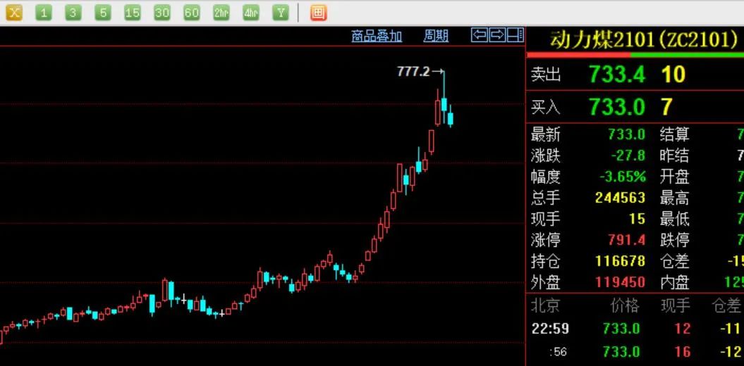11月以来,电力企业上游原料动力煤价格不断攀升。动力煤期货01合约在站稳600元整数位关口后,走出了一轮单边上涨行情,半个月时间涨超150元,CCI5500指数再度暂停报价。12月11日,主力合约动力煤期货价格再度触及涨停,涨幅4%,报777.2元/吨。不过,周五夜盘,动力煤主力期货价格出现大幅跳水。