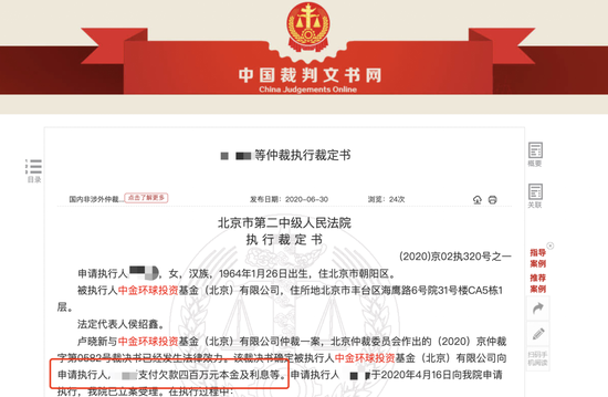 据裁判文书网公开资料显示,中金环球投资基金(北京)有限公司多次被告上法庭,其中在申请执行人卢女士与中金环球投资基金(北京)有限公司仲裁一案中,北京仲裁委员会作出的(2020)京仲裁字第0582号裁决书已经发生法律效力。该裁决书确定被执行人中金环球投资基金(北京)有限公司向申请执行人卢晓新支付欠款四百万元本金及利息等。
