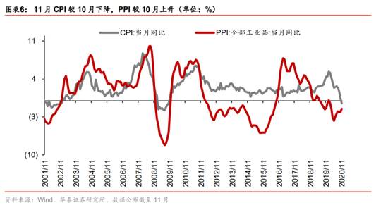 11月社融存量和金融机构贷款余额同比增速分别为13.6%/12.8%,均相比于10月下降0.1pct,此轮宽信用周期的拐点或已现,与此同时,11月M1同比与M1-M2同比增速差相比于10月均出现明显回升。从历史来看,2003/2007/2009/2012/2015/2017/2019信贷同比增速领先于M1同比、M1-M2增速差约6-9月,意味着信用周期拐点后至少再经历6个月货币下沉,利好股市流动性。而M1同比、M1-M2增速差均领先于PPI约6个月,M1-M2增速差扩大反映出企业部门经营活跃,在此基础上,我们认为后续PPI大概率有望加速回升,对应顺周期板块盈利有望进一步改善。