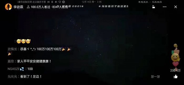 12月13日晚至14日凌晨,摄影师李政霖在微信视频号进行了一场“陪你去看双子座流星雨”的直播,当晚这场直播累计在线人数过百万,成为第一个破圈的爆款视频号直播案例——而这距离视频号上线直播功能才刚刚过去两个月。