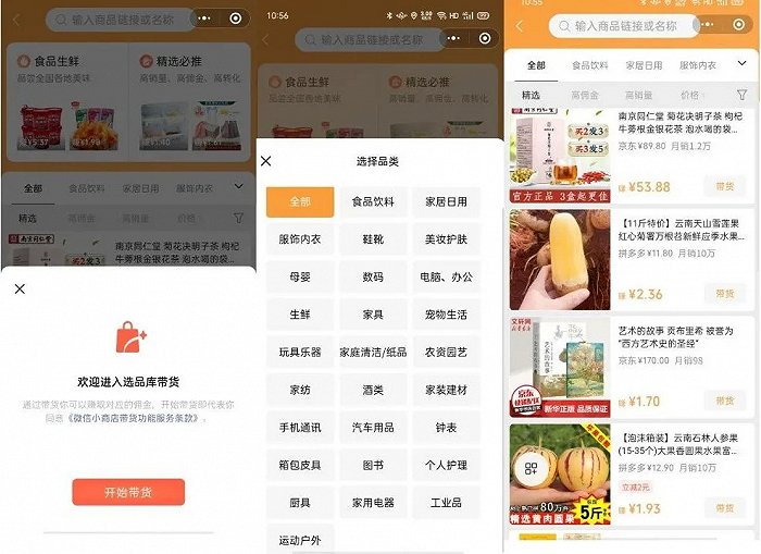 目前,视频号直播商品还是统一走微信小商店的渠道,支持京东、拼多多、有赞商品的链接导入;此外,还支持在“选品库带货”小程序中直接挑选带货商品,其中的商品也是来自京东、拼多多等,主播可以根据品类、佣金、销量等指标筛选。