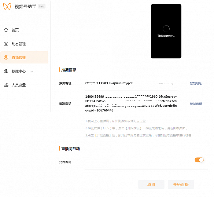 此外,近期关于视频直播推流功能的消息也很多,此前微信给部分企业和媒体开通了推流功能。微信开放社区内的官方回复是视频号推流能力目前在内测中,根据一些用户流传出来的图片看,可以通过beta版的视频号助手(PC网页版视频号助手)在电脑上推流,支持OBS推流。