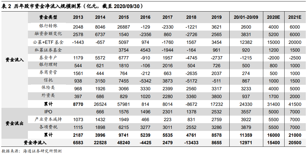 在《增量资金望超两万亿——2021年资金入市测算-20201204》中,我们提出场外的增量资金在牛市孕育期尚在观望,在爆发期后期才开始入场,在泡沫期加速涌入。本轮牛市的孕育期从19/1/04上证综指的2440点至20/03/19的2646点,期间月均资金净流入约900亿元。上证综指2646点为此次牛市爆发期3浪的起点,截止20/09/30期间月均资金净流入约1200亿元,可见从资金面的角度看19、20年基本符合牛市孕育期和爆发期的资金入市特征。今年前三季度股市资金流入项合计2.4万亿,流出项合计1.1万亿,20Q1-Q3合计净流入1.3万亿。我们预计2020年全年资金净流入1.5万亿,2021年超2万亿元,具体测算数据如下表2。