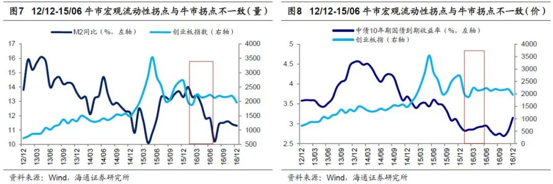 12/12-15/06牛市后期,宏观流动性非常充裕,M2同比从15/04开始筑底回升,在16/01达高点14.0%,M2同比与工业增加值累计同比的差值在15/01开始筑底回升,16/01达高点8.3个百分点。然而,15年下半年A股却大幅回调,期间创业板指最大跌幅达56%,主要是源于15年4月起监管层开始清查配资,15年6月12日证监会发文严打场外配资,清查券商违规接入系统,由此触发场外配资去杠杆,微观流动性遭到破坏,可见宏观流动性拐点和牛市拐点变化趋势并不一致。