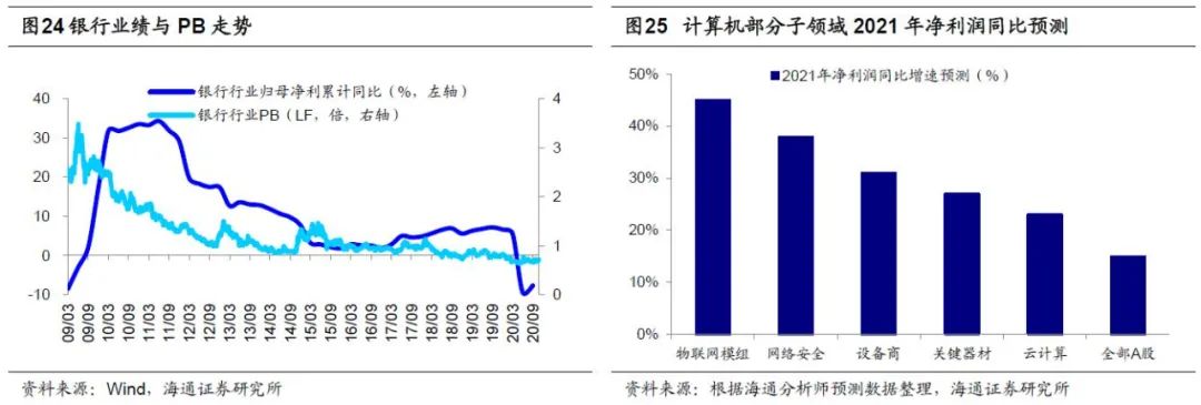 中长期科技+消费。中长期视角看,本轮牛市是转型升级牛,主线是科技+消费。我们认为21年行业配置的第一梯队是科技:一是政策推动,“十四五”规划建议稿强调坚持创新驱动发展,科技自立自强,加快在关键核心技术领域实现突破;二是产业链扩散,2010-2015年前后科技股行情上下游行业间传导过程是从电子设备开始、逐渐向软件内容传导并扩散至场景应用,当前正处5G引领的新一轮科技周期中,前期以硬件为主,中后期带动软件革新需求,最终万物互联、人工智能,依照硬件-软件-内容-应用场景规律,往后看计算机(云计算、人工智能)、传媒(游戏等)、新能源产业链等产业发展空间更大。科技的背面是券商。短期看,牛市成交量放大将推高券商业绩,20Q3券商归母净利润单季度同比高达73%,但今年以来申万券商行业涨幅只有8%;中期看,金改将改变券商业态,当前中国产业结构升级目标类似美国,即大力发展科技产业,融资结构也将对标,然而美国券商ROE13%、中国仅6%,我们认为金改最终将提高券商ROE。20Q3基金重仓股中券商股持有市值占比为1%,相比沪深300(自由流通市值)低配8.1(4.3)个百分点。
