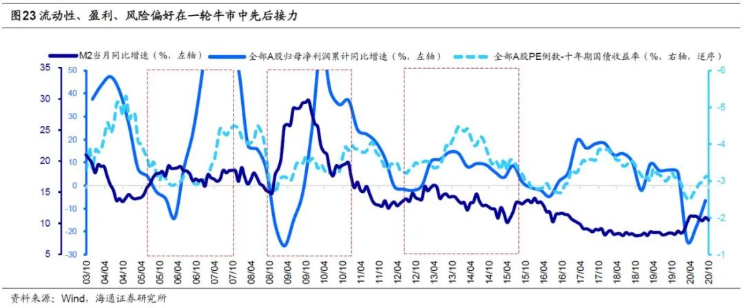 明年宏观流动性比今年整体偏紧,市场走势关键在于基本面。对于明年基本面的判断,我们认为主要考察全部A股归母净利润累计的同比增速和ROE(TTM)。我们预计A股净利累计同比增速将持续回升至2021年3季度,ROE持续回升至2021年4季度,因此牛市还在路上。这是源于:一是依据库存周期,本轮补库存周期原本从19年11月启动,期间疫情有所扰动,历史上一轮库存周期平均持续21个月,依次推断这次补库存将持续至21Q3;二是政策时滞,历史上政策面领先基本面3-9个月,我们预计以社融增速、贷款余额增速和M2同比为代表的宏观流动性指标拐点可能在21年一季度末二季度初,对应盈利高点21Q3前后。