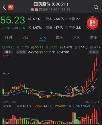 上周累计上涨22.50%的国药股份早盘也“一字板”跌停。截至午间收盘,国药股份成交额为4.5亿元,跌停板上的封单为25.3万手。