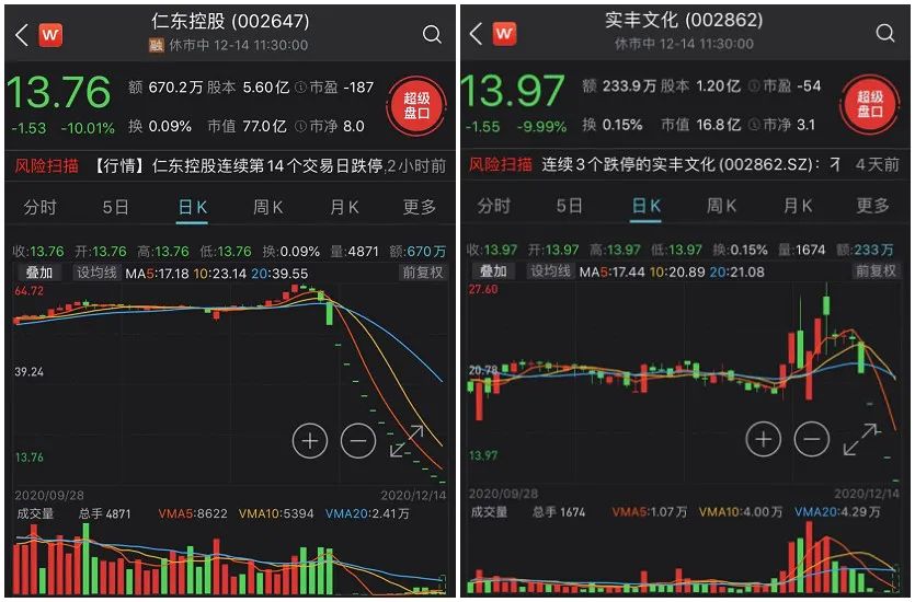 仁东控股、实丰文化的“一字板”跌停还在继续。截至午间收盘,仁东控股已连续14个交易日跌停,跌停板上的封单为203.3万手;实丰文化已连续5个交易日跌停,跌停板上的封单为23.7万手。
