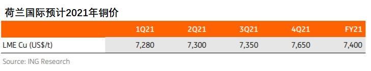 相比三月4,630美元/吨的低点,铜价已经反弹了64%,看多叙事很大程度上已经被铜价上涨所消化。不过,市场想要维持目前的上涨趋势需要一个有利的宏观环境,以及美元的进一步贬值。荷兰国际预计2021年LME三个月期铜均价为7,400美元/吨。
