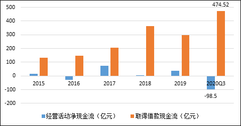 因此,在今年普遍降杠杆、强调回款的年份,蓝光发展前三季度的经营活动现金流却流出高达98.50亿元。与此同时,取得借款收到的现金流入高达474.52亿元,创下历年最高。
