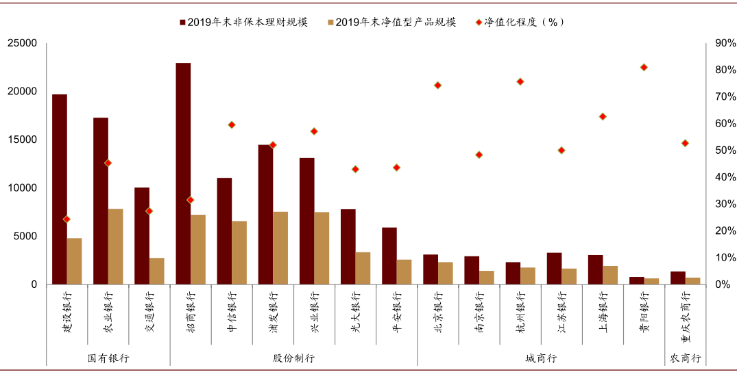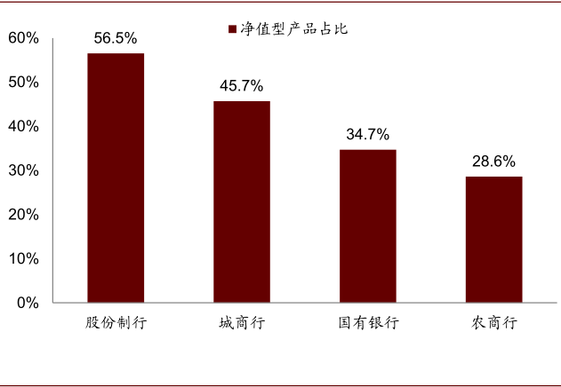 图表: 分机构类型看,股份制银行净值型产品占比最高(截止2019年末)