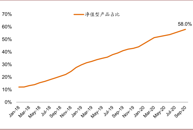 图表: 截止2020年9月末,净值型产品占全部理财产品存续余额的58%