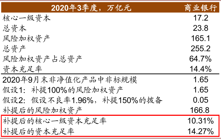 假设所估算的1.65万亿元非标回表,按照100%风险权重补提风险加权资本并按照3季度商业银行表内不良率和150%的拨备覆盖率计提拨备,补提后的核心一级资本充足率为10.3%,资本充足率为14.3%,较3季度末分别下降13bp和14bp。银行拨备计提压力可控,我们认为中长期非标不良压力较低,根据前述假设估算非标回表需要计提拨备500亿元。