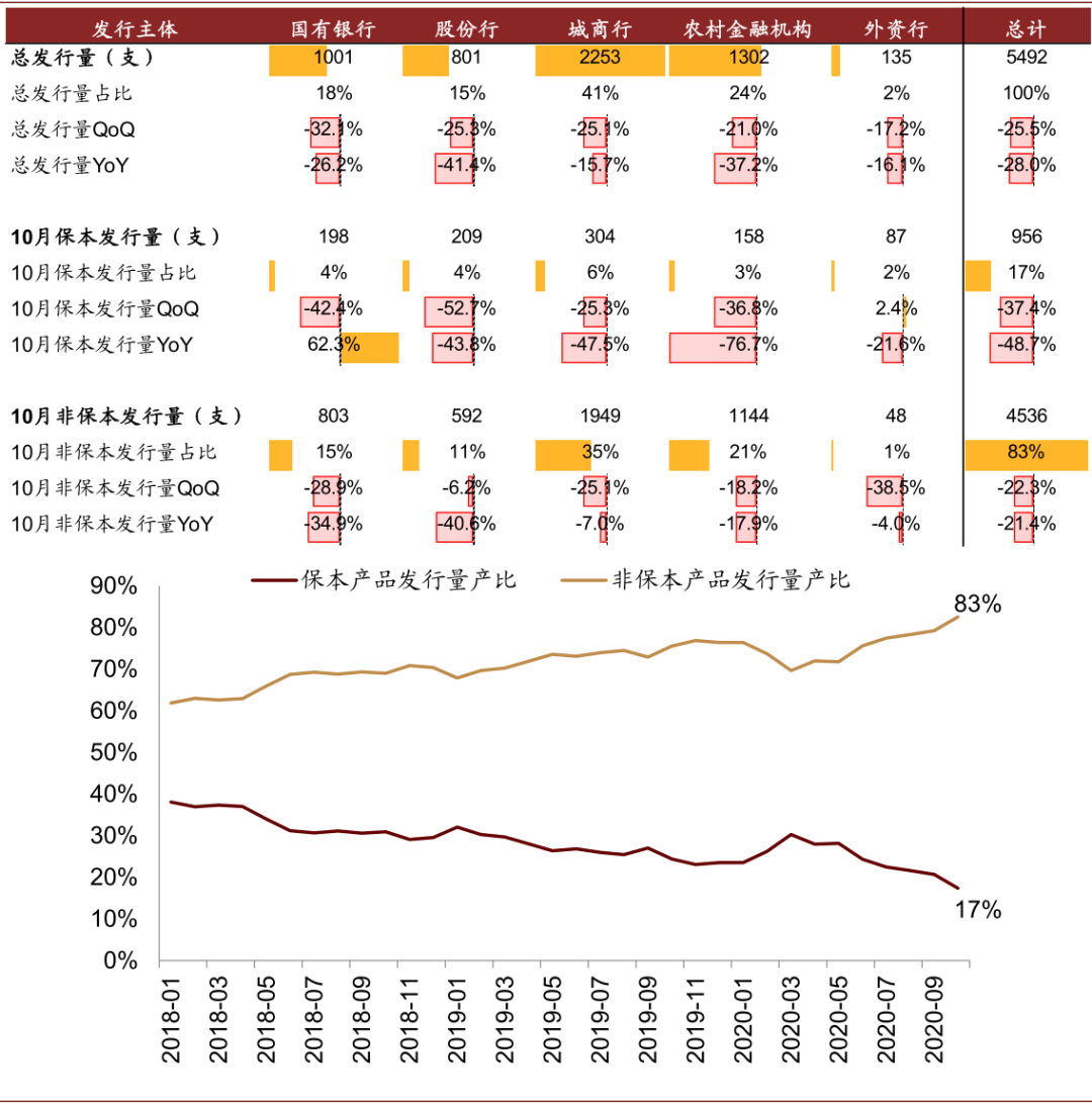 作为非净值化产品的底层资产,非标规模会随着老产品到期不续作继续下降。实际上,保本型理财产品发行量压降已经明显。普益标准监测数据显示,10月289家银行共发行了5492款银行理财产品,产品总发行量同比减少28%。其中,保本型理财产品发行量压降较为明显,10月保本型理财产品发行量同比下滑49%,保本型理财产品发行量占总发行量的17%(vs. 2018年末的30%)。同时,非保本理财产品发行量同比下滑21%。