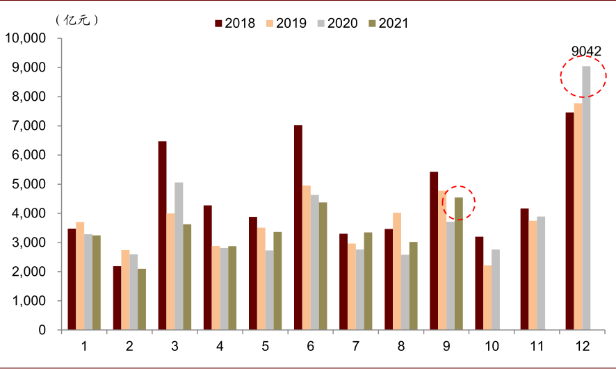 图表: 2020年末信托到期量显著高于季节性,超过9000亿元。前瞻2021年,可见到期压力不及2018年高峰(金麒麟分析师)
