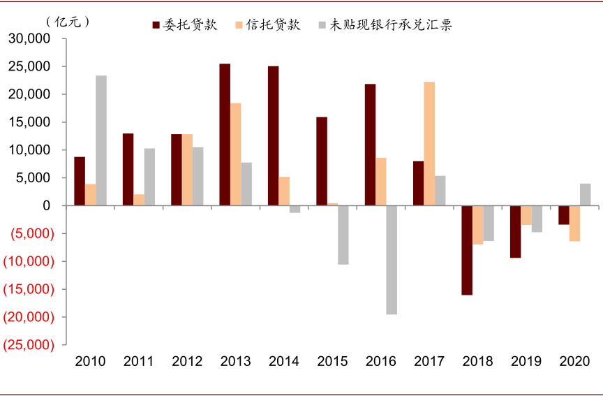 图表: 2018年以来,新增社融中投放非标资产的委托贷款、信托贷款和未贴现银行承兑汇票均出现负增长,近两年负增长不及2018年峰值