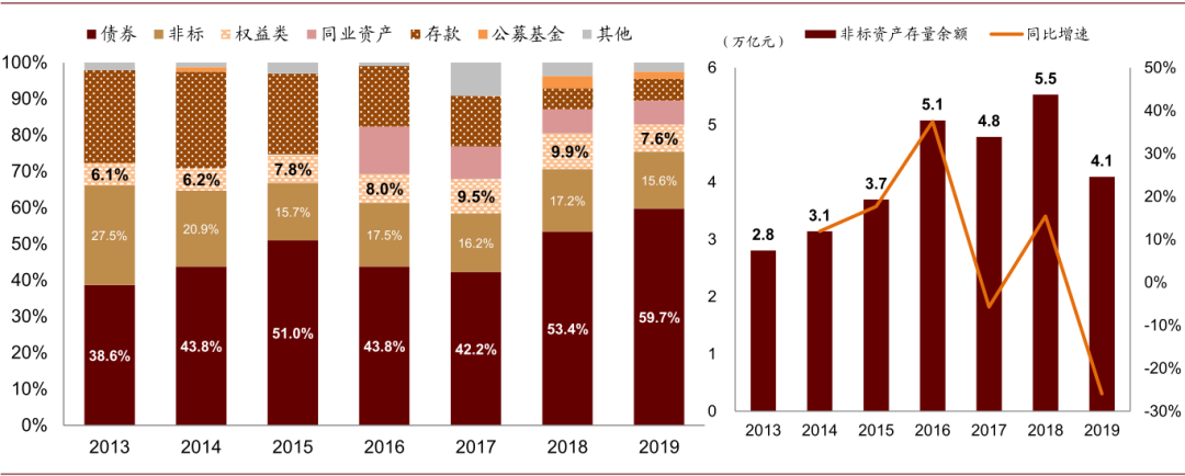 图表: 非标资产配置比例从2013年的27.5%下降到2019年的15.6%,截止2019年末有4.1万亿元的非标存量余额
