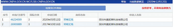 据悉,Dentyl Active品牌于2018年进入中国市场,主打产品抗菌除口臭漱口水,产品单价在100元左右,中国总代为麦凯莱。中国商标网显示,DENTYL ACTIVE和邓特艾克第3类商标的申请人分别为Periproducts和麦凯莱,申请时间几乎同步,均为2017年10月和2020年5月。