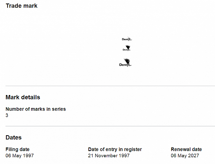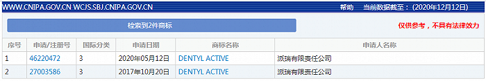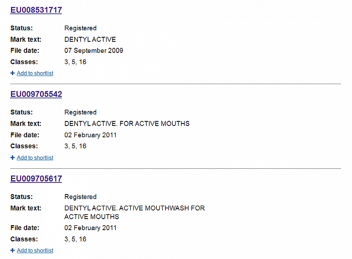 或许正因为D.D.D. Limited已自身难保,VLG集团在完成对Dentyl Active品牌的收购后,有着口腔护理基因的Periproducts开始发挥主要作用。英国知识产权局显示,DENTYL ACTIVE、DENTYL ACTIVE. FOR ACTIVE MOUTHS等一系列第3类商标的申请时间为2009年-2011年,目前VLG集团是这些商标的持有人。而DENTYL第3类商标的持有人正是Periproducts,也是DENTYL ACTIVE商标在中国的申请人。