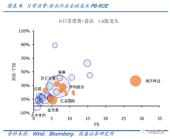 4、A股消费龙头估值基本上与全球消费龙头接轨。A股消费龙头估值体系也正在从PE-G向PB-ROE演变。